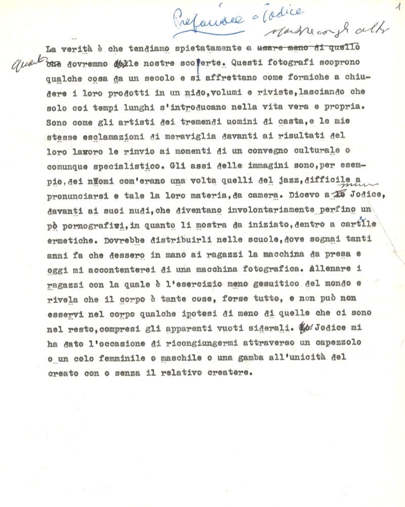 La verità è che tendiamo spietatamente a spartire con altri meno di quanto dovremmo le nostre scoperte. Questi fotografi scoprono qualche cosa da un secolo e si affrettano come formiche a chiudere i loro prodotti in un nido, volumi e riviste, lasciando che solo coi tempi lunghi s'introducano nella vita vera e propria. Sono, come gli artisti, dei tremendi uomini di casta, e le mie stesse esclamazioni di meraviglia davanti ai risultati del loro lavoro le rinvio ai momenti di un convegno culturale o comunque specialistico. Gli assi delle immagini sono, per esempio, dei nomi com'erano una volta quelli del jazz, difficili a pronunciarsi, e tale resta la loro materia, da camera. Dicevo a Mimmo Jodice, davanti ai suoi nudi, che diventano involontariamente perfino un po' pornografici, in quanto li mostra da iniziato, dentro a cartelle ermetiche! Dovrebbe distribuirli invece nelle scuole, dove sognai tanti anni fa che dessero in mano ai ragazzi la macchina da presa e oggi mi accontenterei di una macchina fotografica. […]