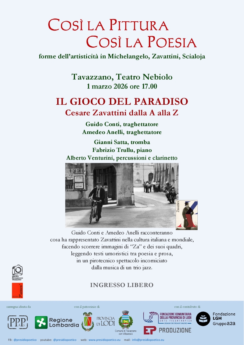 Domenica 1 marzo 2026, alle ore 17, il Teatro Nebiolo di Tavazzano ospita il secondo appuntamento della rassegna ideata dal Presidio Poetico Così la Pittura, Così la Poesia. L’evento si intitola Il gioco del paradiso – Cesare Zavattini dalla A alla Z , una conferenza-spettacolo che intreccia riflessione critica, immagini, letture e musica dal vivo.